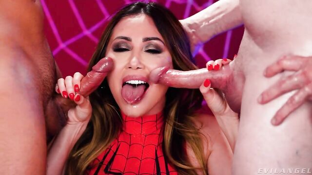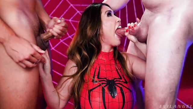Description: Statuesque, stacked stunner Kianna Dior portrays The Amazing SpiderGirl in a special parody scene for Halloween! The long-haired MILF beauty's skin-tight, red-and-black disguise shows off her big boobs. She takes off her mask, drawing two hard-ons (and the audience) into her web! Hungering to give blowjobs, Kianna kneels between two naked, ready erections. When she's not wetly sucking Jonni Darkko and Jay Smooth's hard boners, she's talking dirty! Kianna swirls her tongue on the tools and strokes the shafts with manicured fingers. Drool runs down her chin. She groans, gurgles and gasps as Jonni's big cock fucks her throat. This BJ superhero deepthroats both dicks, sucks balls and plays with the slobber strands connecting the pricks to her face. Wanting her semen fix, Kianna says, 'Blow your web on my face.' A thick, sloppy double cum facial coats her forehead and fills her eye sockets, dripping onto her tongue and tits. The guys' rods smear jism into her skin and mouth. She swallows sperm, saying her super powers are increasing! A graphic instant replay shows the facial slathering again, close up and in slow-motion!