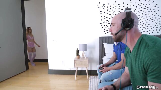 Description:Molly wants some attention from some guys while they are playing video games. She strokes their cocks until they can’t take it anymore. They turn off the game and takes turns fucking her pussy and mouth until they both blow their loads all over her face.