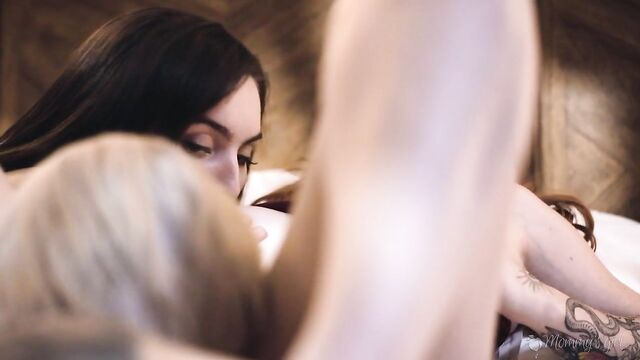 Description:Freya Parker and her friend Arietta Adams are having a slumber party at Freya's house. As the girls prepare to watch a movie, Freya's stepmom, Kenzie Taylor, asks if they want popcorn. The girls decline the offer, but Freya gets up to use the washroom before the movie starts. As Freya leaves the room, Arietta notices Kenzie checking Freya out.Arietta tells Kenzie that she can see that Kenzie is lusting after Freya. After initially denying it, Kenzie admits that Arietta is right, but Kenzie doesn't want to act on those feelings because Freya is her stepdaughter. Arietta suggests that SHE be a stand-in for Freya, and fulfill Kenzie's desire to be with a younger woman. Arietta tells Kenzie to wait in her bed later with a blindfold over her eyes, and Arietta will stop in and give her a sexy surprise. Kenzie excitedly agrees.Later that night, Kenzie is blindfolded and waiting in her bed as instructed, when Arietta comes in. But what Kenzie doesn't know is that Arietta is accompanied by Freya! Arietta asks Kenzie if she's ready for her surprise, and Kenzie eagerly confirms that she is. Freya caresses Kenzie's thigh and touches her over her panties, then removes her panties and eats out her pussy. Kenzie basks in the pleasure, unaware that it's Freya and not Arietta who is making her feel so good.Eventually, Kenzie gets so excited that she removes her blindfold, and is startled to see that Freya is the one who's been touching her all this time. However, once Kenzie recovers from her shock, she admits that it feels really nice to have her wish granted, so she and Freya decide to keep going... and invite Arietta to join in for a sexy threesome!